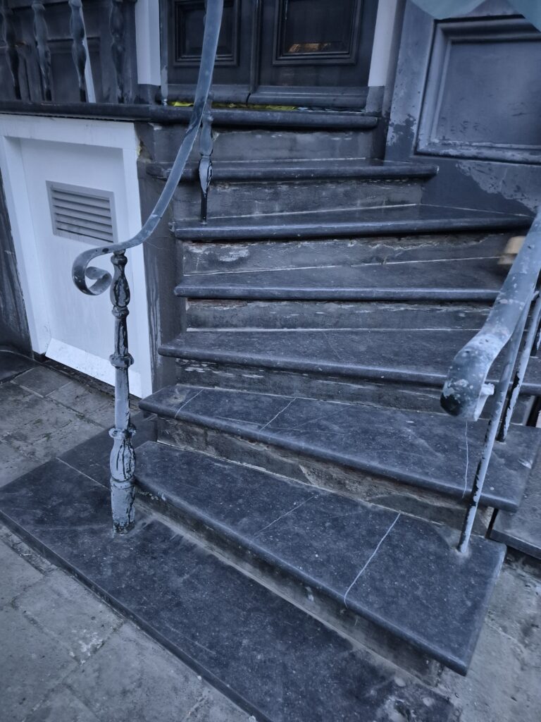 Beschadigde Belgisch hardstenen trap gerestaureerd: gebroken delen gerepareerd en teruggeplaatst, daarna volledig geschuurd, gepolijst en geïmpregneerd voor een strak eindresultaat.