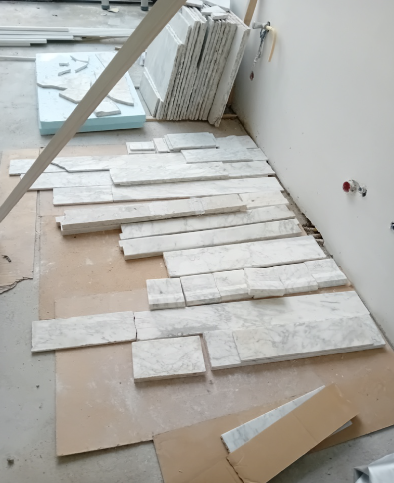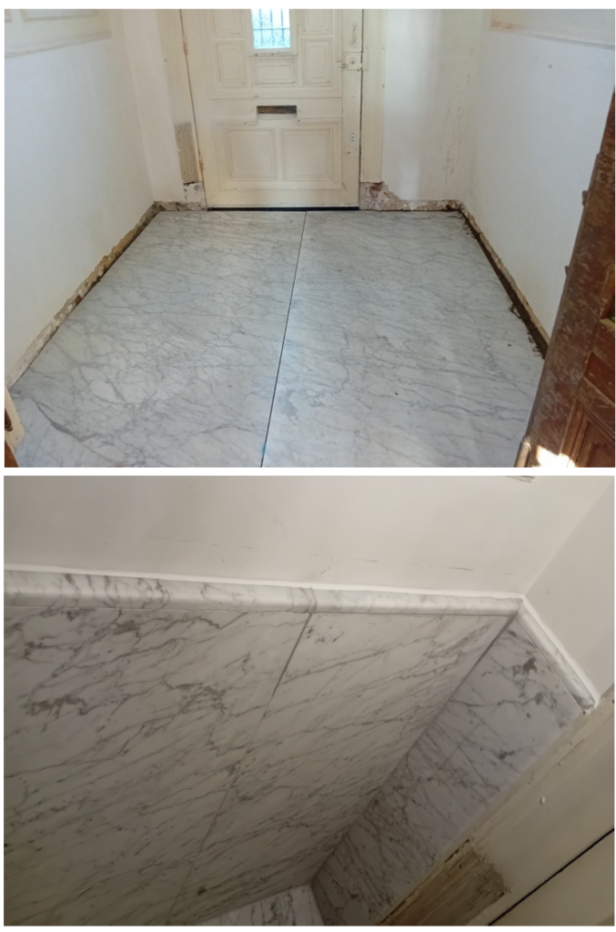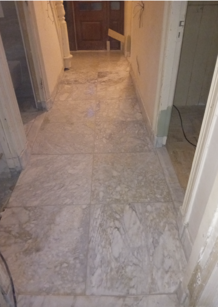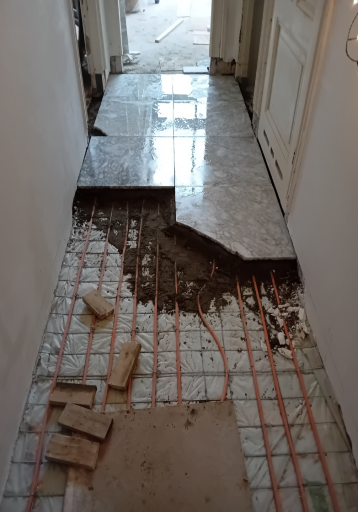 De vloer was sterk beschadigd. De kapotte delen zijn gerepareerd en hersteld, waarna ze opnieuw op de vloerverwarming zijn geplaatst. Vervolgens is de vloer geschuurd en gepolijst. Tot slot is de vloer geïmpregneerd, zodat het oppervlak beter beschermd is en weer in een mooie, egale staat verkeert.